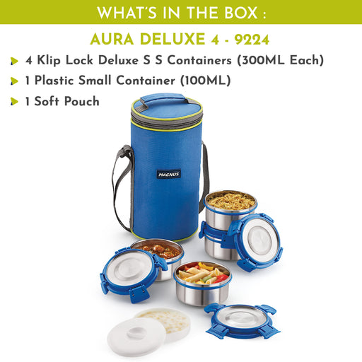 Original price Rs. 1,243.00 - Original price Rs. 1,243.00Original price Rs. 1,243.00Rs. 1,243.00Rs. 1,243.00 - Rs. 1,243.00Current price Rs. 1,243.00Magnus Aura 4 Deluxe Stainless Steel Lunch Box for Kids | Airtight, Leakproof, Insulated | Ideal Lunch Boxes for Office Men, Women | Hot Meals | Convenient Carrying Pouch (Blue)