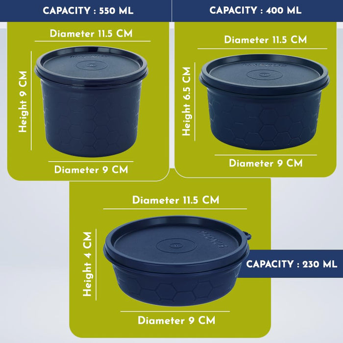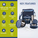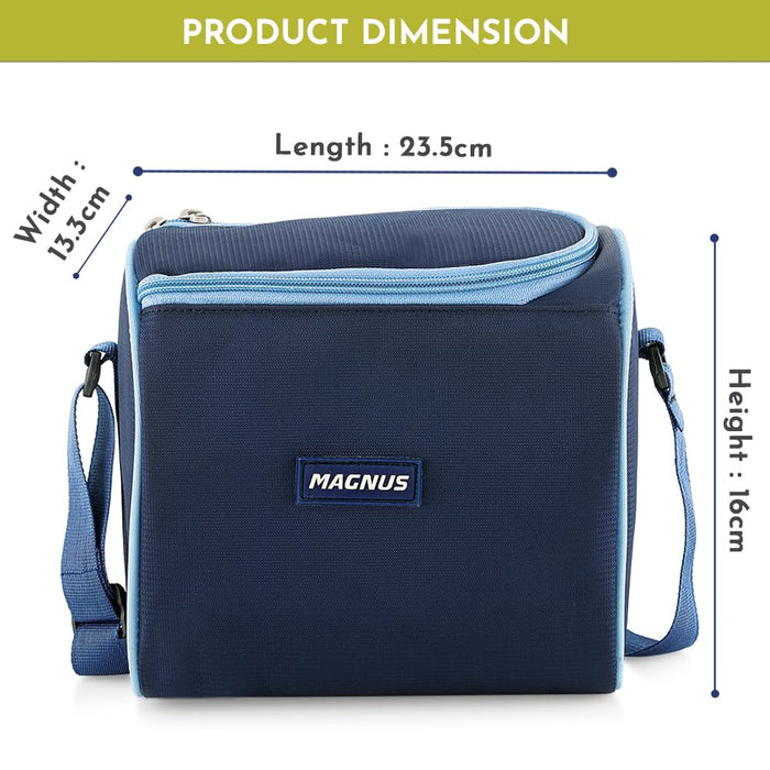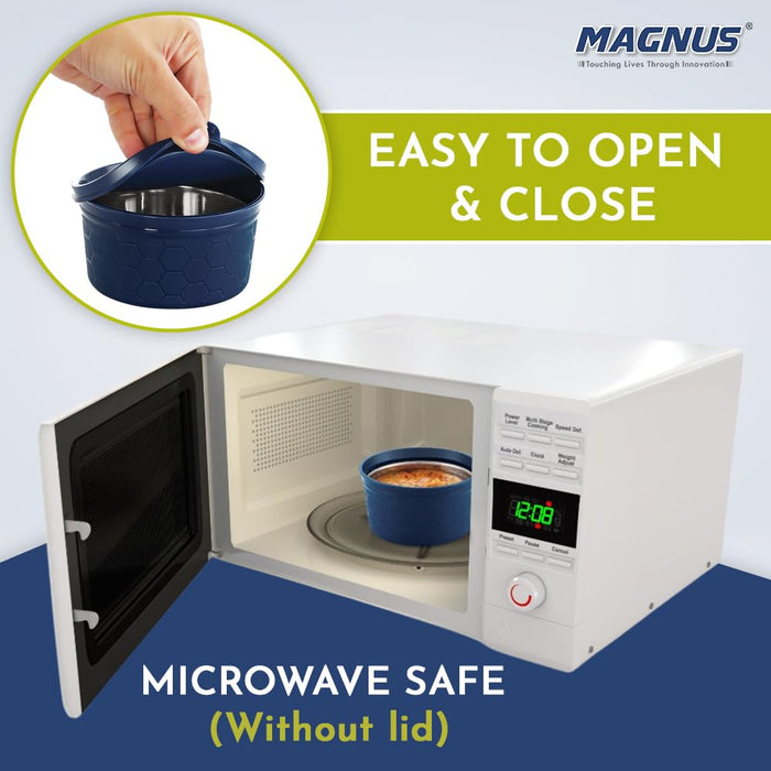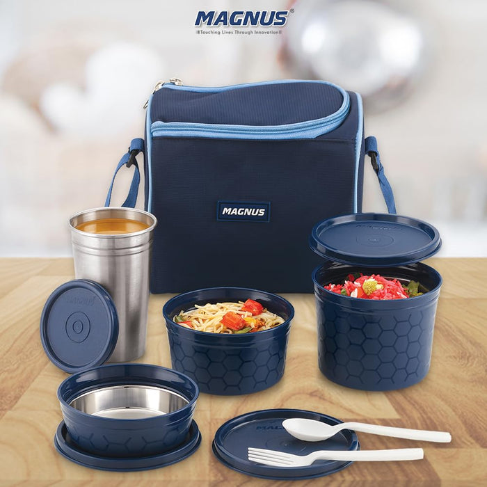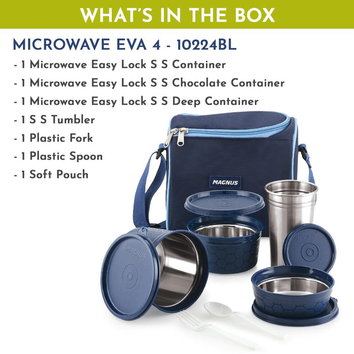 Introducing the Magnus Microwave Eva 4 Lunch Box, a perfect blend of functionality and elegance. This meticulously designed lunch box set is ideal for both kids and adults, making it the ultimate choice for anyone seeking a versatile and reliable solution for their daily meal needs. Whether you need a steel tiffin box for kids, tiffin bags for office, or a stainless steel lunch box, this product has it all. The Magnus Microwave Eva 4 Lunch Box comes with three microwave-safe containers, each equipped with a steam lock to ensure that your meals remain fresh and delicious. The containers are available in sizes of 150 ml, 300 ml, and 450 ml, providing ample space for a variety of dishes. Additionally, the set includes a stainless steel tumbler, perfect for keeping your beverages at the desired temperature throughout the day. The containers are airtight and leakproof, ensuring that your food stays secure and spill-free, whether in a lunch bag for kids to school or a tiffin bag for office for women. Crafted with precision, this lunch box is not only practical but also stylish. The blue exterior adds a touch of sophistication, making it suitable for use as a lunch box for office women or a lunch box for girls. The durable materials used in the construction of this product guarantee longevity, making it a reliable companion for years to come. The Magnus Microwave Eva 4 Lunch Box is also an excellent choice for those who require a lunch box for school with a bag, as it comes with a convenient carrying case. In summary, the Magnus Microwave Eva 4 Lunch Box offers a comprehensive meal solution for both kids and adults. Its airtight and leakproof design, coupled with microwave-safe containers and a stainless steel tumbler, makes it the perfect choice for school, office, or any on-the-go meal needs. Choose the Magnus Microwave Eva 4 Lunch Box for a convenient, stylish, and reliable meal experience every day.