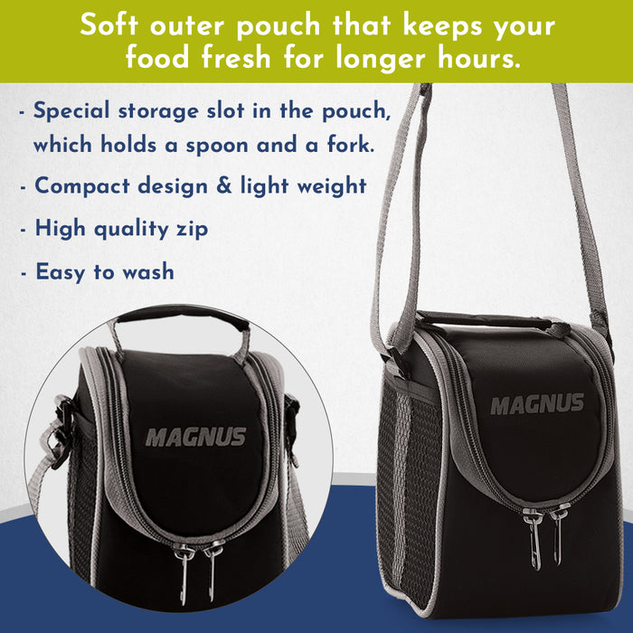 Description : Introducing the Magnus Opal-2 Microwave Steam Lock Stainless Steel Lunch Box Set, an exceptional solution designed to meet the diverse needs of men, women, and kids alike. This premium set includes two 350ml stainless steel containers, each meticulously crafted to offer durability, convenience, and style. Whether you're searching for a reliable steel tiffin box for kids or efficient tiffin bags for office, our product stands out as the ideal choice. Crafted from high-quality stainless steel, these lunch boxes are perfect for retaining the freshness and flavor of your meals. The innovative microwave steam lock technology ensures that your food remains warm and delicious, making it an excellent lunch box for office women and men. Each container is designed to be leak-proof, providing peace of mind whether you're carrying a hot lunch box for kids to school or a sophisticated office lunch box for men. The Magnus Opal-2 set is not just functional but also stylish. The sleek black design of the tiffin bag complements any professional or casual setting, making it a versatile option for everyone. The compact size of 350ml x 2 is perfect for portion control, fitting comfortably in lunch bags for office women and men alike. Additionally, the set includes a convenient lunch bag for kids to school, ensuring that even the youngest family members can enjoy their meals in style. In conclusion, the Magnus Opal-2 Microwave Steam Lock Stainless Steel Lunch Box Set is the ultimate choice for anyone seeking a reliable, stylish, and functional lunch box solution. Whether you need a kids lunch box for school, a tiffin box for office for women, or lunch boxes for office men, this set meets all your requirements and more. Invest in quality, convenience, and style with the Magnus Opal-2 set and elevate your lunch experience to new heights.
