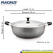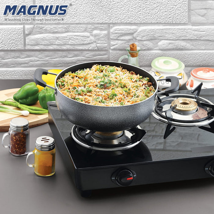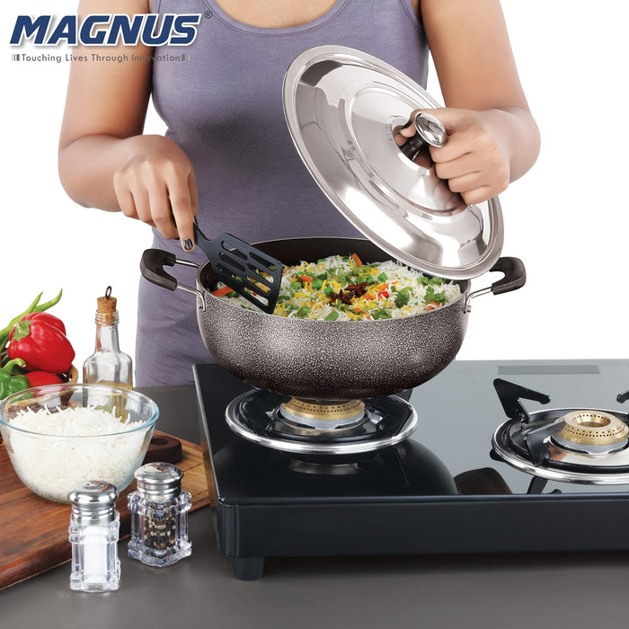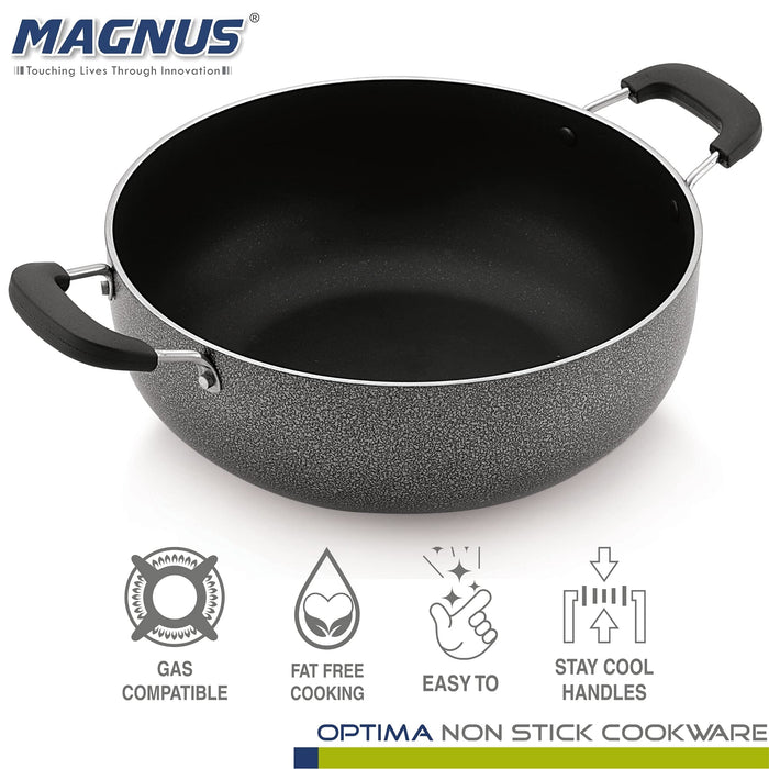 Magnus Optima Deep Kadhai is a "Made in India" Non-stick Aluminum Cookware crafted from high grade aluminum. The product comes with a FDA approved virgin PFTE 3 layer non-stick coating which helps in cleaning like breeze. Also, it provides uniform heating and avoids any hotspots while cooking and thus provides top-notch cooking experience. The cookware comes with a sturdy bakelite side grab handle which remains cool while cooking food. The product comes with a standard one year warranty as well against any manufacturing defects.