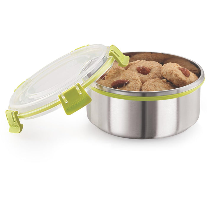 Introducing the Magnus Klip Lock Stainless Steel Airtight Leakproof Storage Container, a premium kitchen accessory designed to elevate your storage solutions. This set of four 300 ML containers is meticulously crafted to cater to your diverse storage needs, whether it's for kitchen storage boxes, lunch boxes for office men, or tiffin boxes for kids. The Magnus Klip Lock containers are fabricated from high-quality stainless steel, ensuring durability and resistance to rust and corrosion. These containers are perfect for storing a variety of kitchen accessories items, such as dry fruits, snacks, and other essentials. The airtight seal guarantees that your food remains fresh and free from contaminants, making these containers ideal for both kitchen and on-the-go use. Each container features a robust Klip Lock mechanism that provides a secure, leakproof seal, preventing spills and maintaining the integrity of your food. This makes them perfect for use as lunch boxes for office women, school lunch boxes for boys, or even a hot tiffin box for office meals. The sleek, modern design complements any kitchen decor, adding a touch of sophistication to your kitchen accessories collection. These containers are also perfect for organizing your kitchen. Use them as part of a kitchen containers set to keep your pantry neat and orderly. The airtight seal makes them ideal for storing dry fruits, snacks, and other perishables, ensuring long-lasting freshness. kitchen In summary, the Magnus Klip Lock Stainless Steel Airtight Leakproof Storage Container set is a must-have for anyone looking to enhance their kitchen storage solutions. With their durable construction, versatile use, and stylish design, these containers are perfect for various storage needs, from kitchen organization to on-the-go meals. Invest in the best with Magnus, and experience the convenience and reliability of premium kitchen accessories.