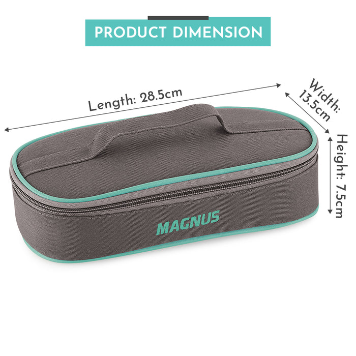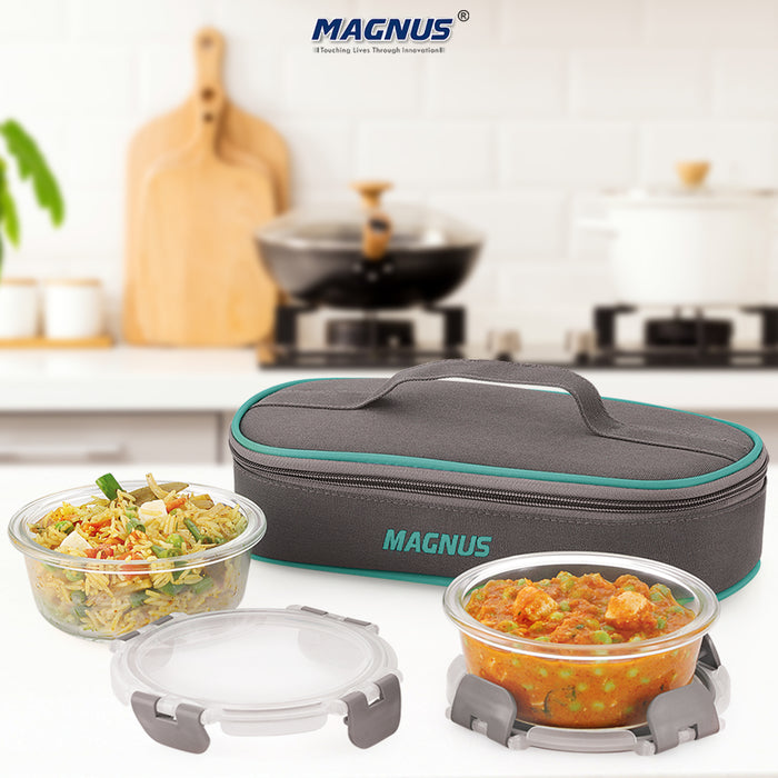 Introducing the Magnus Glock Solid Glass Lunch Box, an exemplary choice for individuals who demand both style and functionality in their kitchen and office essentials. This premium lunch box for office users is meticulously crafted with borosilicate glass, ensuring durability and resistance to temperature changes, making it a perfect companion for your daily meal needs. The Magnus lunch box features a flat pouch design that houses two round glass containers, each with a generous capacity of 400 ML. These containers are not only air-tight and leak-proof but also microwave safe, providing you with the convenience to heat your meals without transferring them to another dish. Ideal for those with a busy lifestyle, this glass lunch box ensures your food remains fresh and flavorful throughout the day. Our Glock mechanism offers an easy yet secure closure, guaranteeing that your meals are safely stored and transported without any spillage. The Detachable clip adds an extra layer of convenience, allowing you to easily carry your lunch box, whether you are heading to the office or on an outdoor adventure. This versatile glass container set is not just limited to office use. Its aesthetic design makes it an excellent gift for girls, a thoughtful gesture for occasions such as birthdays or anniversaries. Moreover, it serves as a practical addition to your kitchen storage solutions, doubling as air tight containers for kitchen storage, helping you organize your fridge storage or dry goods like a professional.