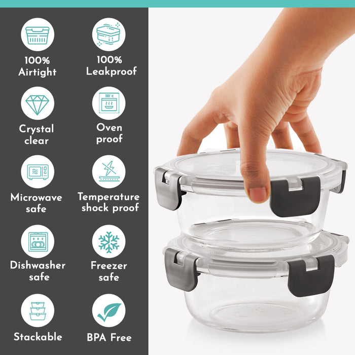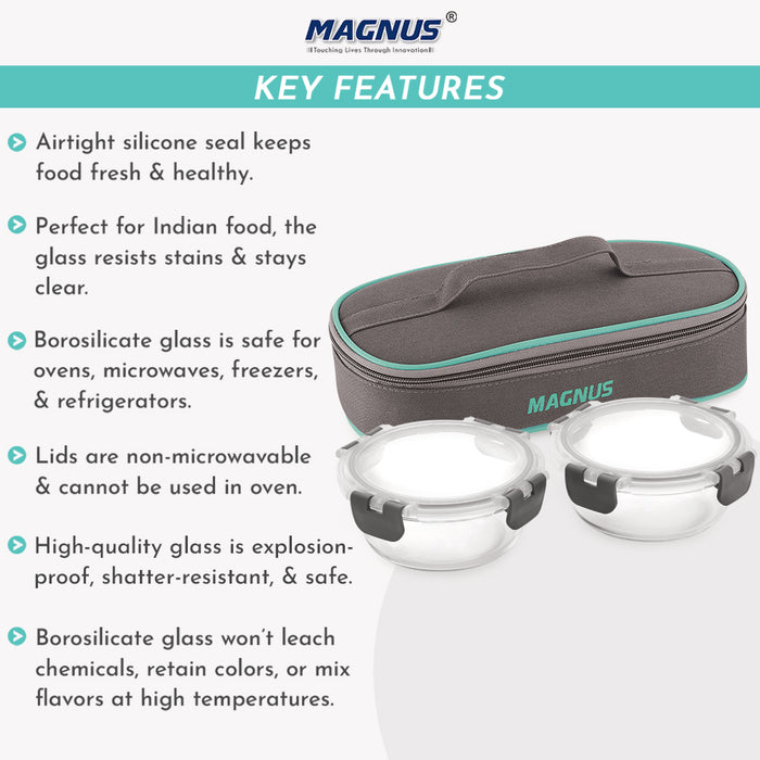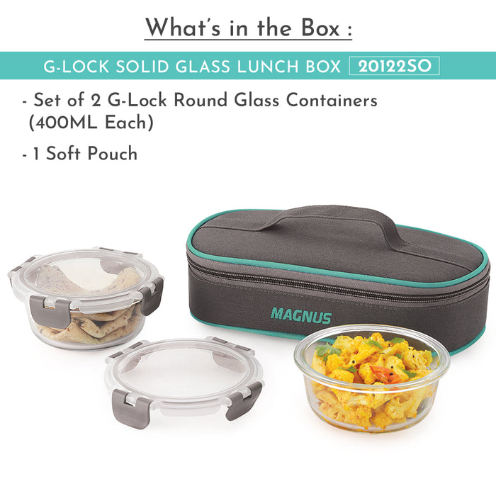 Magnus Glock Solid Glass Lunch Box with Flat Pouch and Fixed Clip, Includes 2 Round Airtight, Leakproof, Microwave Safe Borosilicate Glass Containers, 400 ML Each