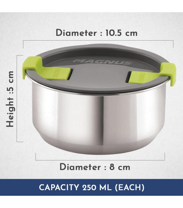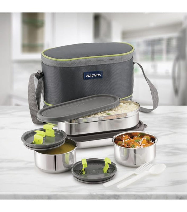 Introducing the Magnus Olive-4 Stainless Steel Lunchbox, a versatile and practical solution for all your meal storage needs. Designed with precision and crafted from high-quality stainless steel, this lunchbox is perfect for kids, office professionals, and anyone who values a healthy and organized meal routine. The Magnus Olive-4 features four meticulously engineered leak-proof containers and dual long containers, ensuring that your meals stay fresh and intact throughout the day. Whether you are packing a hearty lunch for your child or a sophisticated meal for your office, this lunchbox caters to all. The airtight sealing mechanism guarantees no spills or leaks, making it an ideal choice for lunch boxes for kids, tiffin bags for office, and stainless steel lunch boxes for school or work. One of the standout features of the Magnus Olive-4 is its insulated carry case. This case is not only stylish but also functional, maintaining the temperature of your food for longer periods. It is perfect for office lunch boxes for men and women, ensuring your meals remain warm and delicious until it's time to eat. The compact design and lightweight nature make it easy to carry, whether you're heading to school, office, or a picnic. For those looking for a comprehensive meal storage solution, the Magnus Olive-4 Stainless Steel Lunchbox is the best lunch box available. Its versatility, durability, and stylish design make it suitable for everyone - be it kids, office goers, or anyone in need of a reliable food storage option. Make the smart choice today and invest in a lunchbox that truly understands your needs.