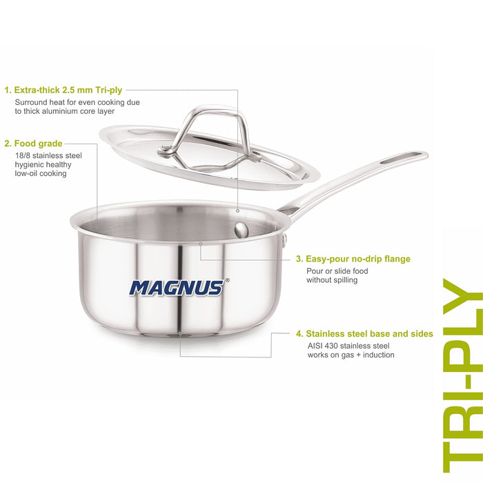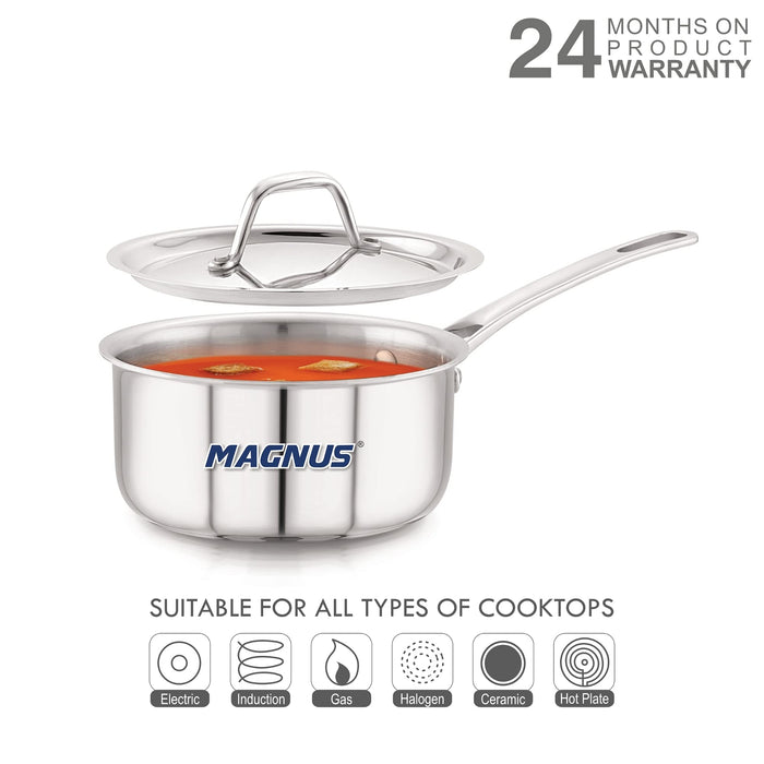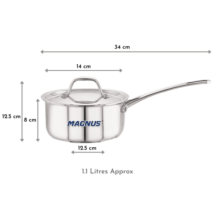 Magnus Triply Stainless Steel Sauce Pan with Stainless Steel Lid and Induction Bottom, 14 cm|1.1 L, Silver|Use for Home, Kitchen and Restaurant - Easy to Clean and Dishwasher Oven Safe