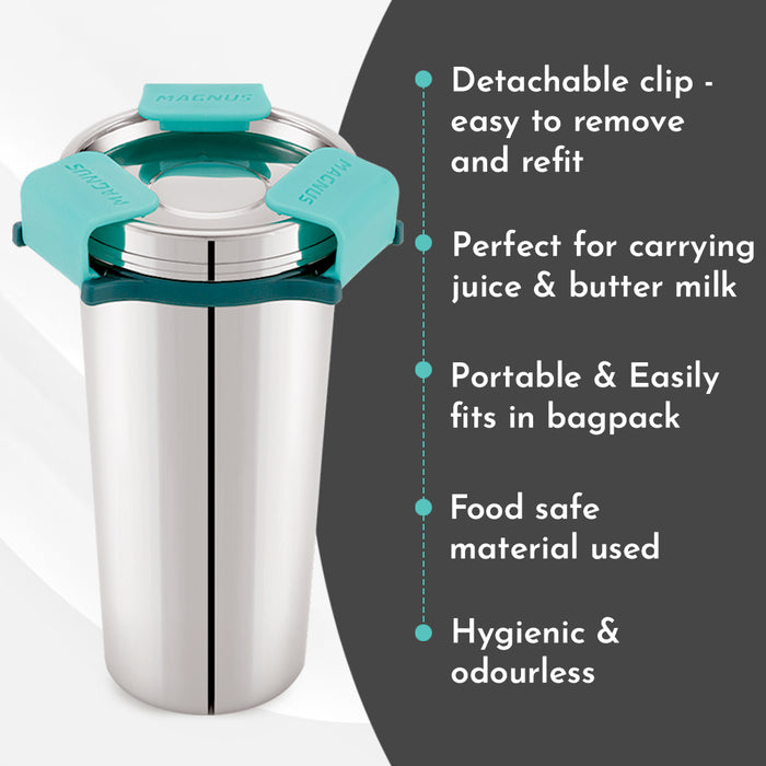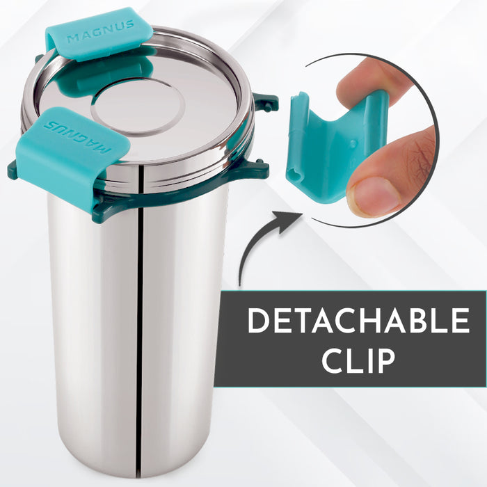 Introducing the Magnus Stainless Steel Revlock Glass Glossy (500 ml) a sleek and versatile companion for your daily hydration needs. Crafted with premium stainless steel, this 500 ml tumbler is designed to keep your beverages at the perfect temperature while on the go. Whether you're commuting to work, traveling, or simply enjoying a day out with the family, this tumbler ensures your drinks stay fresh and enjoyable. One of its standout features is the leak-proof and airtight lid, providing you with peace of mind against spills and leaks, making it ideal for tossing into your bag or backpack. The Rev Lock mechanism ensures a secure seal, keeping your drinks safe and secure wherever you take it. Perfect for a variety of beverages, from refreshing juices to traditional lassi or buttermilk, this tumbler caters to all tastes and preferences. Its sleek design and portable size make it a convenient choice for both adults and kids alike. Say goodbye to disposable beverage containers and make a sustainable choice with the Magnus Stainless Steel Matte Klip Lock Tumbler. Elevate your hydration experience with this stylish and functional accessory that seamlessly fits into your busy lifestyle.