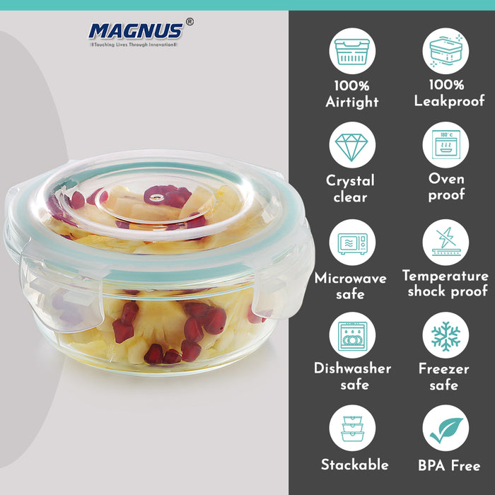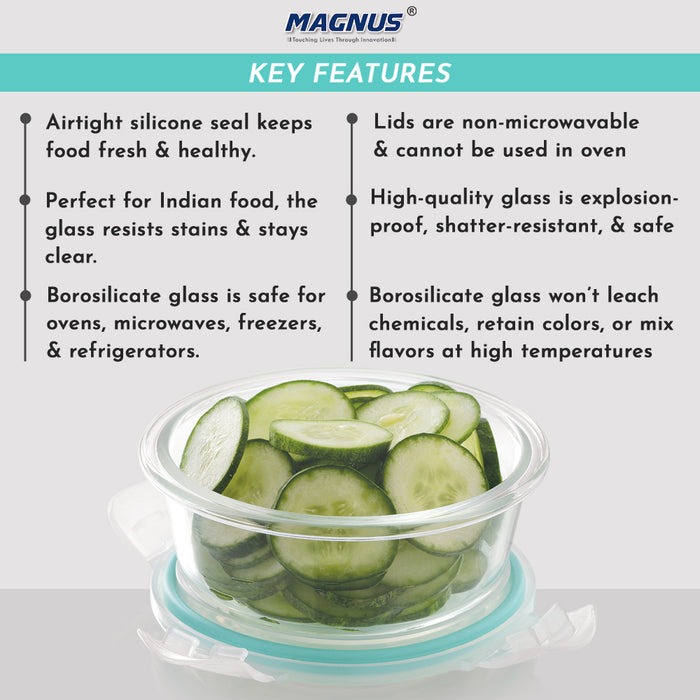 Magnus Vivid Glass Food Round Container with a Fixed Lock—a kitchen essential that combines functionality and elegance. Made from high-quality borosilicate glass, this 400ML container is perfect for fridge organization and microwave use. Its durable design makes it ideal for various storage needs, from lunch boxes for office workers to tiffin boxes for kids. The fixed lock ensures your food stays fresh and secure, while the airtight seal keeps it perfectly stored. Transition seamlessly from fridge to microwave without worry—no cracks or breaks. In summary, the Magnus Vivid container is a versatile, reliable, and stylish addition to any kitchen, catering to all your storage needs.